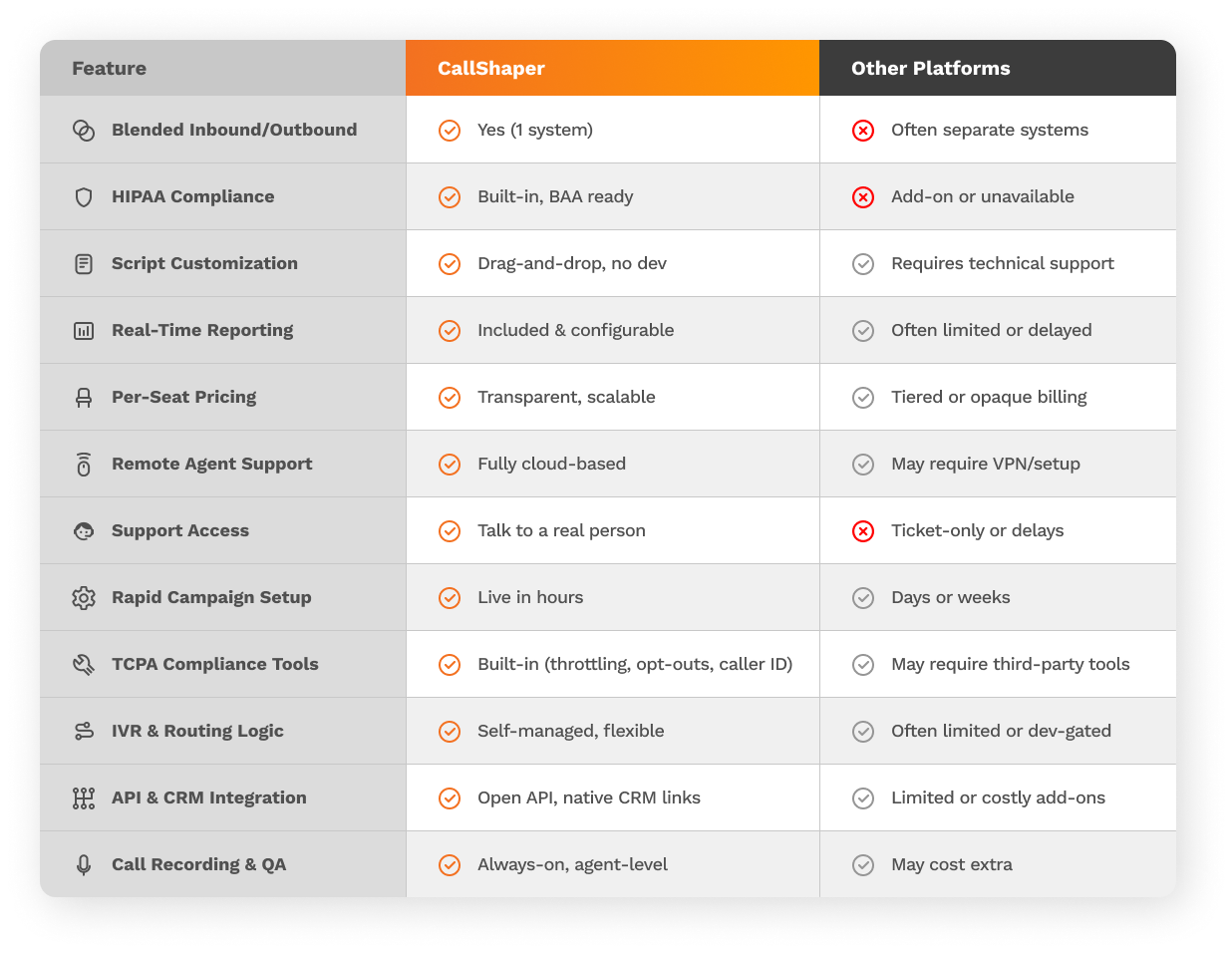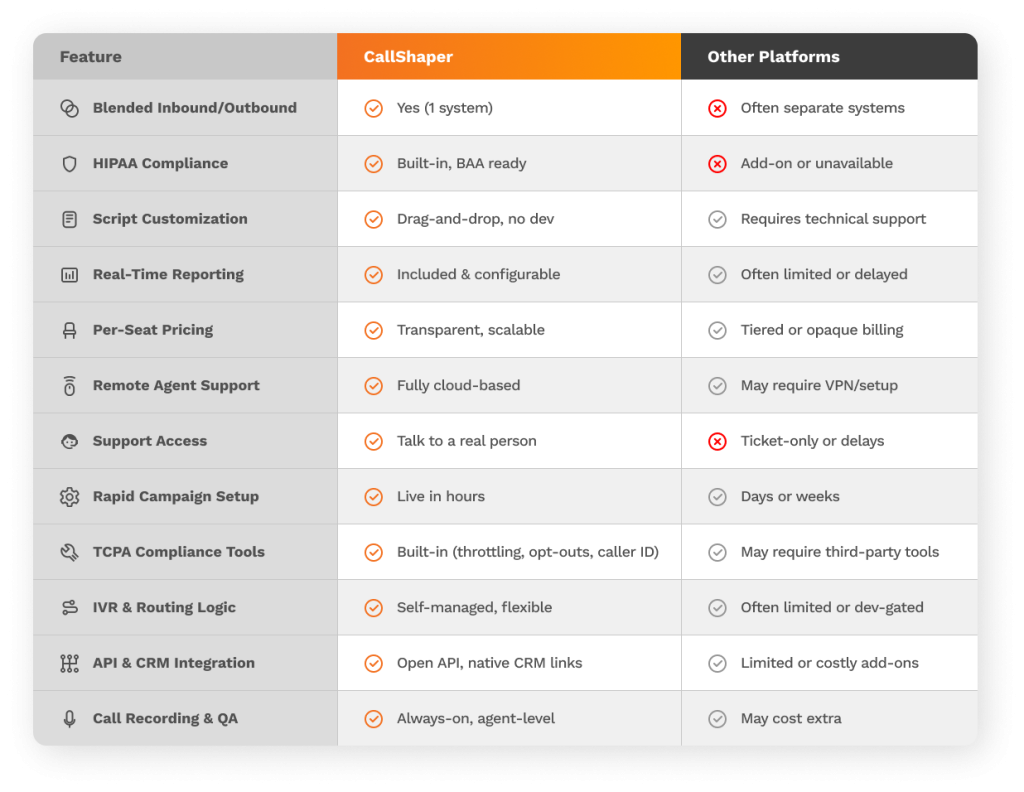 CallShaper includes built-in features to help teams stay compliant with HIPAA, TCPA,